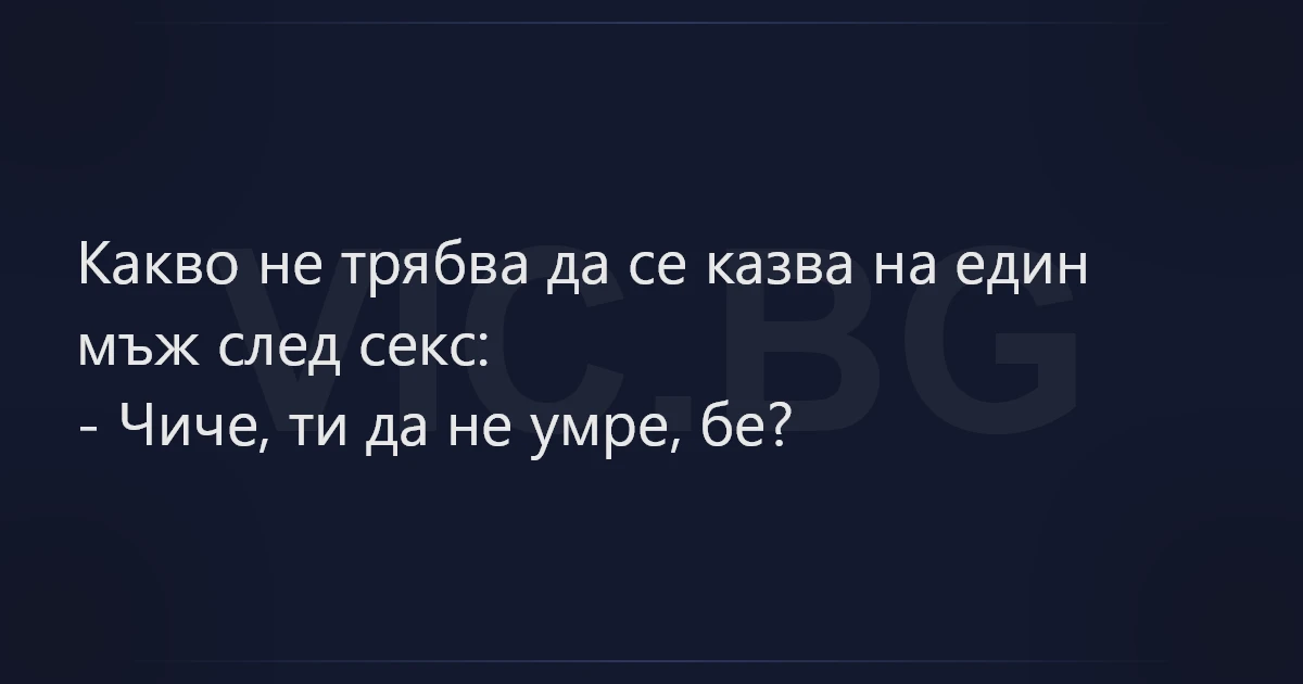 Какво не трябва да се казва на един мъж след секс: - Чиче, ти да не умре, бе?