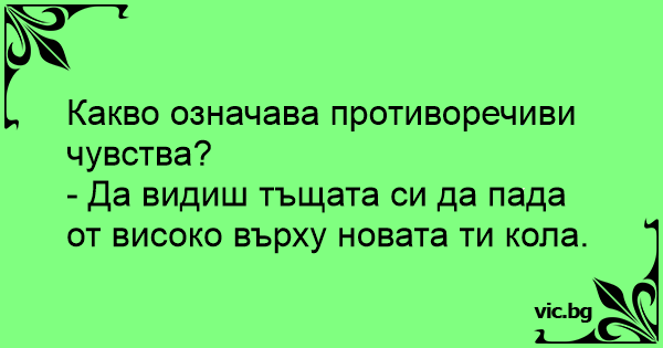 - Mi az abszolút vegyes érzelem? - Ha látjuk, amint az anyósunk a szakadékba zuhan a vadonatúj Mercedesünkkel.
