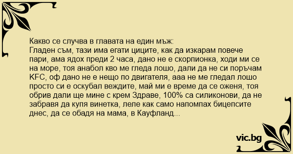 Гладен съм, тази има егати цициte, как да изкарам повече пари, ама ядох преди 2 часа, дано не е скорпионка, ходи ми се на море, тоя анабол кво ме гледа лошо, дали да не си поръчам KFC, оф дано не е нещо по двигателя, ааа не ме гледал лошо просто си е оскубал веждите, май ми е време да се оженя, тоя обрив дали ще мине с крем Здраве, 100% са силиконови, да не забравя да купя винетка, леле как само напомпах бицепсите днес, да се обадя на мама, в Кауфланд има антифриз на промоция, дали ще ми даде да ги пипна, оф много ме експлоатират в тая работа, не трябваше да продавам голфа, ама тази наистина има егати бюста...
