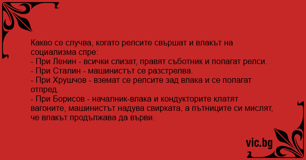 Какво се случва, когато релсите свършат и влакът на социализма спре: - При Ленин - всички слизат, правят съботник и полагат релси. - При Сталин - машинистът се разстрелва. - При Хрушчов - вземат се релсите зад влака и се полагат отпред. - При Борисов - началник-влака и кондукторите клатят вагоните, машинистът надува свирката, а пътниците си мислят, че влакът продължава да върви.