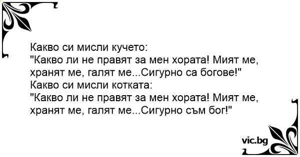 Ero kissan ja koiran välillä. - Koira ajattelee: Tuo ihminen hoitaa minnua, ruokkii minut ja on minulle muutenkin hyvä. Hän on jumala! - Kissa ajattelee: Tuo ihminen hoitaa minnua, ruokkii minut ja... Šuo: Jis mane maitina, Jis manimi rūpinasi, Jis suteikia man pastogę, Jis turbūt Dievas!Katinas: Jis mane maitina, Jis manimi rūpinasi, Jis suteikia man pastogę, Aš turbūt Dievas! Egy kutya gondolatai: - Itt lakom ezzel az emberrel, aki etet engem, meleg szállást biztosít, simogat és szeret engem. Ezek szerint ő az Isten! Egy macska gondolatai: - Itt lakom ezzel az emberrel.... Le chien pense: Ils me nourrissent, ils me soignent, ils doivent être des dieux. Le chat pense: Ils me nourrissent, ils me soignent, je dois être un dieu. Los perros piensan: "Los seres humanos son benévolos, me dan de comer y cuidan de mí; deben de ser Dioses." Los Gatos piensan: "Los seres humanos son benévolos, me dan de comer y cuidan de mí;... Кучето си мисли: " Ето моя собственик...Грижи се за мен, храни ме, играе си с мен, ..Сигурно е Бог!" Σκέψεις κατοικίδιων ΣΚΕΨΕΙΣ Unterschied Hund und Katze Pes: „Pán mě krmí, stará se o mě, dává mi střechu nad hlavou - určitě to je Bůh!” Kočka: „Pán mě krmí, stará se o mě, dává mi střechu nad hlavou - určitě jsem Bůh!” Пес: — Він мене годує, він про мене дбає, він дає мені дах над головою - мабуть, він Бог! Кішка: — Він мене годує, він про мене дбає, він дає мені дах над головою - мабуть, я Бог! What is the difference between a cat and a dog? Dogs think, "Humans are benevolent, they feed me and take care of me, so they must be Gods. Cats think, "Humans are benevolent, they feed me and take... Hva er forskjellen på hunder og katter? Hunder tenker: - ”Mennesker er snille, gir meg mat og tar vare på meg, så de må være guder.” Katter tenker: - ”Mennesker er snille, gir meg mat og tar vare...