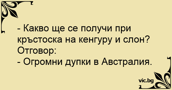 Въпрос към Радио Ереван: - Какво би се получило, ако се кръстоса слон с кенгуру? Радиото отговаря: - Ужасно големи дупки из цяла Австралия.