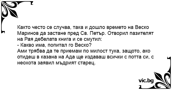 Както често се случва, така и дошло времето на Веско Маринов да застане пред Св. Петър. Отворил пазителят на Рая дебелата книга и се смутил: