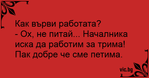 - Ох, не питай... Началника иска да работим за трима! Пак добре че сме петима.