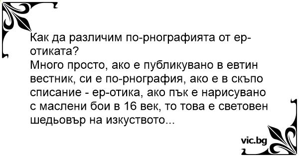 Много просто, ако е публикувано в евтин вестник, си е по-рнография, ако е в скъпо списание - ер-отика, ако пък е нарисувано с маслени бои в 16 век, то това е световен шедьовър на изкуството...