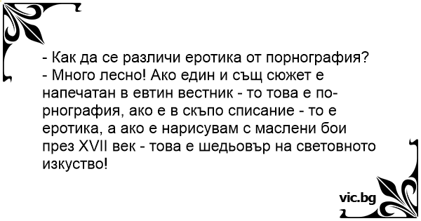 - Много лесно! Ако един и същ сюжет е напечатан в евтин вестник - то това е по-рнография, ако е в скъпо списание - то е еротика, а ако е нарисувам с маслени бои през ХVII век - това е шедьовър на световното изкуство!