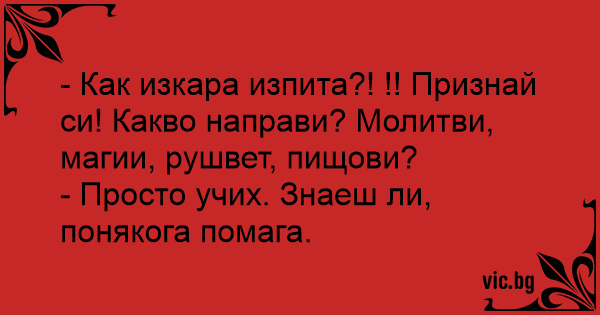 - Как изкара изпита?! !! Признай си! Какво направи? Молитви, магии, рушвет, пищови?