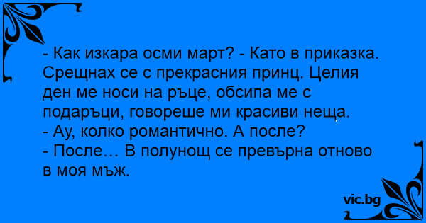 - Как изкара осми март? - Като в приказка. Срещнах се с прекрасния принц. Целия ден ме носи на ръце, обсипа ме с подаръци, говореше ми красиви неща.