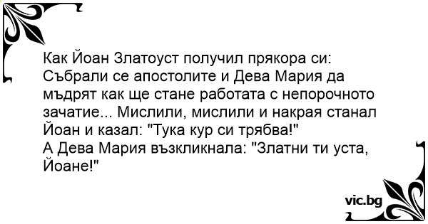 Събрали се апостолите и Дева Мария да мъдрят как ще стане работата с непорочното зачатие... Мислили, мислили и накрая станал Йоан и казал: "Тука kуp си трябва!"