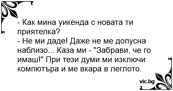 - Не ми даде! Даже не ме допусна наблизо... Каза ми - "Забрави, че го имаш!" При тези думи ми изключи компютъра и ме вкара в леглото.
