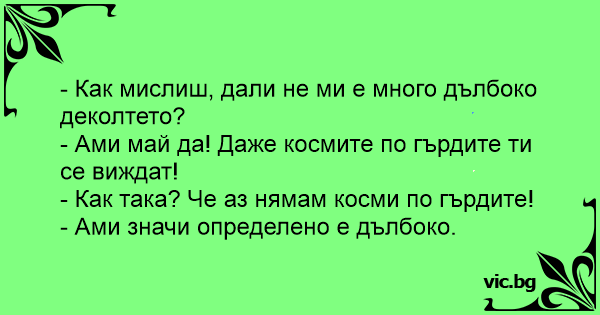 Er: haben sie Haare auf der Brust? Sie: nein, warum? Er: dann befürchte ich, ihr Ausschnitt ist zu tief!