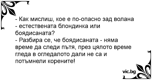 - Как мислиш, кое е по-опасно зад волана - естествената блондинка или боядисаната?