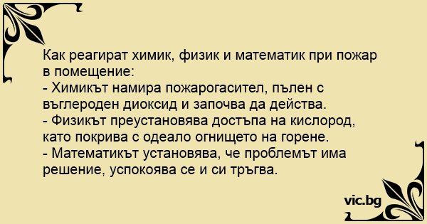 Bir mühendis, bir fizikçi ve bir matematikçi bir hoteldedir. Derken mühendis burnuna gelen duman kokusuyla uyanır, hole çıkar, bir de bakar ki bir yangın var. Eline geçirdiği bir kovaya su...