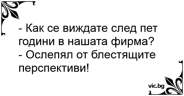 - Как се виждате след пет години в нашата фирма?<br />- Ослепял от блестящите перспективи!