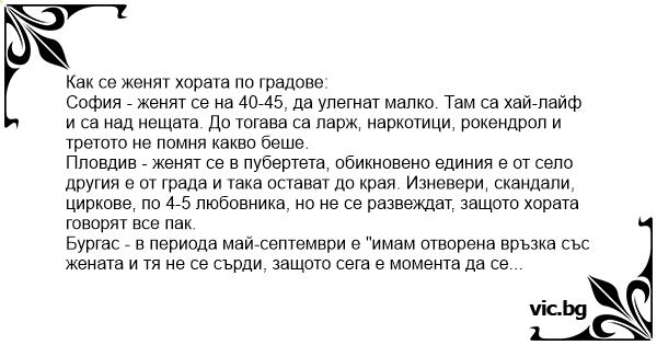 Плевен - там се раждат на 30 вече оженени и на толкова си остават. Няма млади, няма стари. Има поверие, че може би са вампири там...