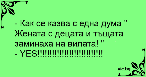 - Как се казва с една дума " Жената с децата и тъщата заминаха на вилата! "