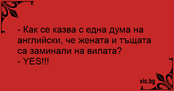 - Как се казва с една дума на английски, че жената и тъщата са заминали на вилата?