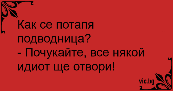 Капитан на боен кораб подозира, че отдолу ги дебне вражеска подводница и праща водолаз да провери. След 2-3 минути той изплава и докладва: