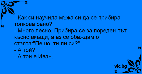 - Много лесно. Прибира се за пореден път късно вкъщи, а аз се обаждам от стаята:"Пешо, ти ли си?"