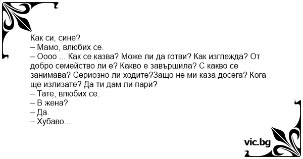 – Oooo ... Как се казва? Може ли да готви? Как изглежда? От добро семейство ли е? Какво е завършила? С какво се занимава? Сериозно ли ходите?Защо не ми каза досега? Кога ще излизате? Да ти дам ли пари?