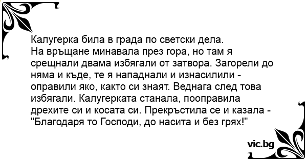 На връщане минавала през гора, но там я срещнали двама избягали от затвора. Загорели до няма и къде, те я нападнали и изнасилили - оправили яко, както си знаят. Веднага след това избягали. Калугерката станала, пооправила дрехите си и косата си. Прекръстила се и казала - "Благодаря то Господи, до насита и без грях!"