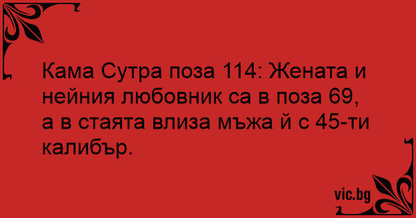 Кама Сутра поза 114: Жената и нейния любовник са в поза 69, а в стаята влиза мъжа й с 45-ти калибър.