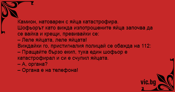 – Пращайте бързо екип, тука един шофьор е катастрофирал и си е счупил яйцата.