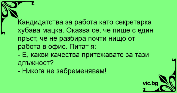 Кандидатства за работа като секретарка хубава мацка. Оказва се, че пише с един пръст, че не разбира почти нищо от работа в офис. Питат я: