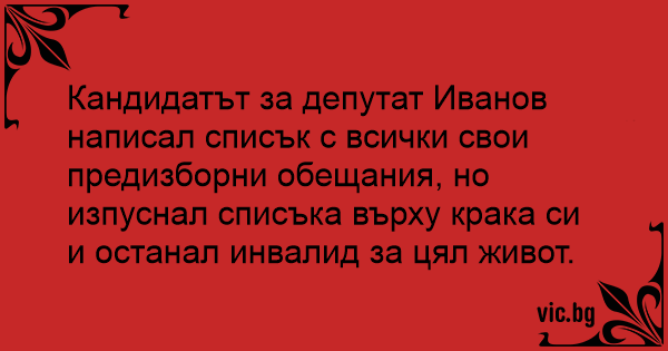 Кандидатът за депутат Иванов написал списък с всички свои предизборни обещания, но изпуснал списъка върху крака си и останал инвалид за цял живот.