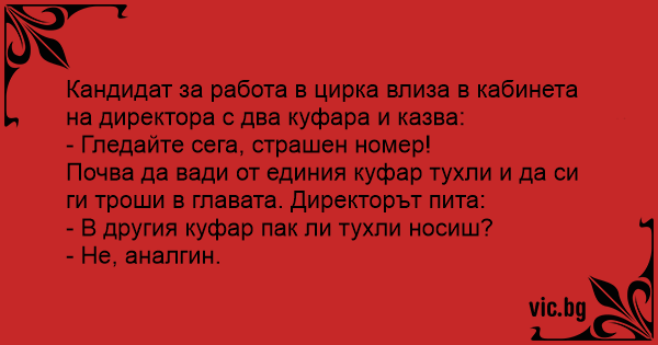 Кандидат за работа в цирка влиза в кабинета на директора с два куфара и казва: