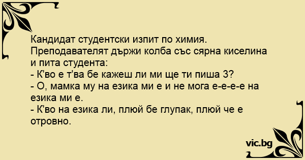 Pan učitel píše na tabuli vzorec H2SO4 a ptá se podřimujícího Petra, co je to za vzorec. Petr koktá: „Pane učiteli, mám to na jazyku.” „Tak to honem vyplivni, protože to je kyselina!”