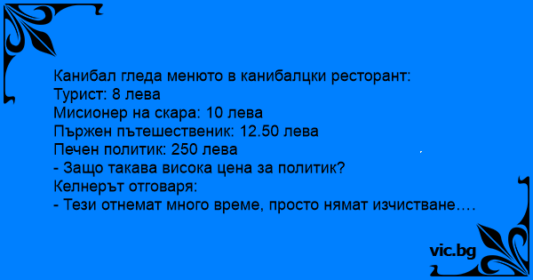 En kannibal kommer inn på en restaurant som drives av en annen kannibal, og får menyen: Kokt misjonær kr. 100,- Stekt oppdagelsesreisende kr. 150,- Ovnsstekt politiker kr. 1000,- Kannibalen...