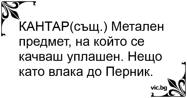 КАНТАР(същ.) Метален предмет, на който се качваш уплашен. Нещо като влака до Перник.