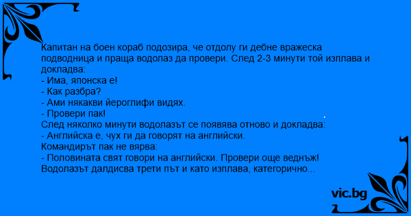 Капитан на боен кораб подозира, че отдолу ги дебне вражеска подводница и праща водолаз да провери. След 2-3 минути той изплава и докладва: