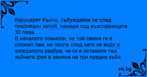 Каруцарят Кънчо, събуждайки се след тридневен запой, намери под възглавницата 30 лева.