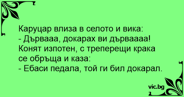 Дядько на возі в'їжджає до села: — Люди !!! Я вугілля привіз !!! Втомлений кінь обертається: — А то ж, курво, ТИ привіз ...