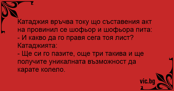 Policininkas sustabdo greitį viršijusį vairuotoją. Išrašo baudą, duoda vairuotojui kvitą ir sako: - Šį kvitą išsaugokite. - O kam man jis? - Kai surinksite dvylika tokių kvitų, galėsite gauti dviratį.