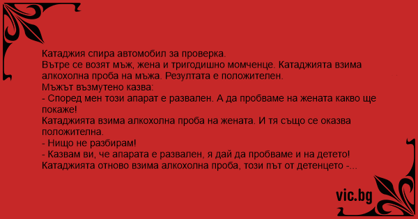 Вътре се возят мъж, жена и тригодишно момченце. Катаджията взима алкохолна проба на мъжа. Резултата е положителен.