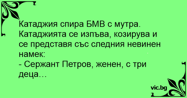 Катаджия спира БМВ с мутра. Катаджията се изпъва, козирува и се представя със следния невинен намек: