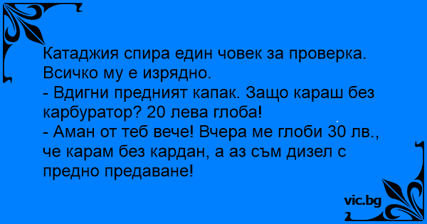 - Аман от теб вече! Вчера ме глоби 30 лв., че карам без кардан, а аз съм дизел с предно предаване!