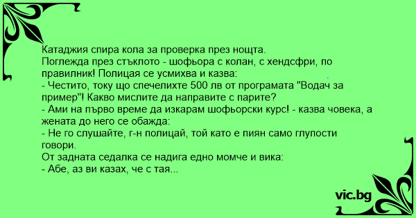 Поглежда през стъклото - шофьора с колан, с хендсфри, по правилник! Полицая се усмихва и казва: