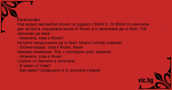 Нов модел автомобил Rover се ударил с BMW 5. От BMW-то изкочили две мутрета, издърпали мъжа от Rover-а и започнали да го бият. Той започнал да вика: