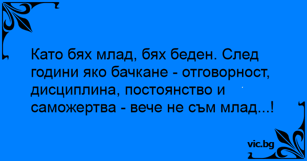 Като бях млад, бях беден. След години яко бачкане - отговорност, дисциплина, постоянство и саможертва - вече не съм млад...!