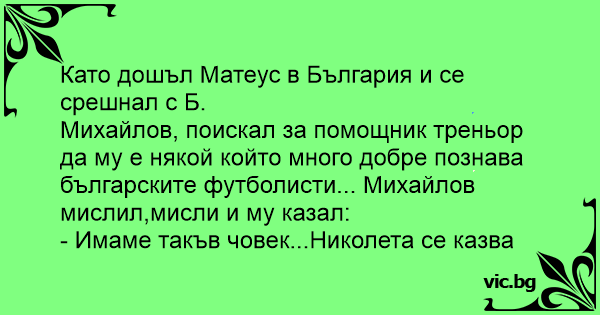 Михайлов, поискал за помощник треньор да му е някой който много добре познава българските футболисти... Михайлов мислил,мисли и му казал: