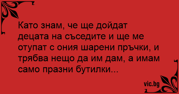 Като знам, че ще дойдат децата на съседите и ще ме отупат с ония шарени пръчки, и трябва нещо да им дам, а имам само празни бутилки...
