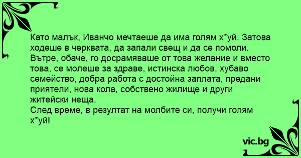 Като малък, Иванчо мечтаеше да има голям хуй. Затова ходеше в черквата, да запали свещ и да се помоли. Вътре, обаче, го досрамяваше от това желание и вместо това, се молеше за здраве, истинска любов, хубаво семейство, добра работа с достойна заплата, предани приятели, нова кола, собствено жилище и други житейски неща.
