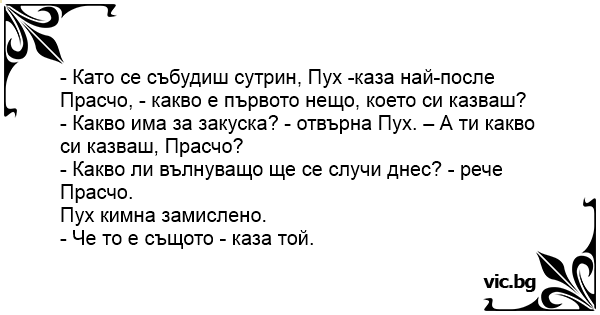 - Какво има за закуска? - отвърна Пух. – А ти какво си казваш, Прасчо?
