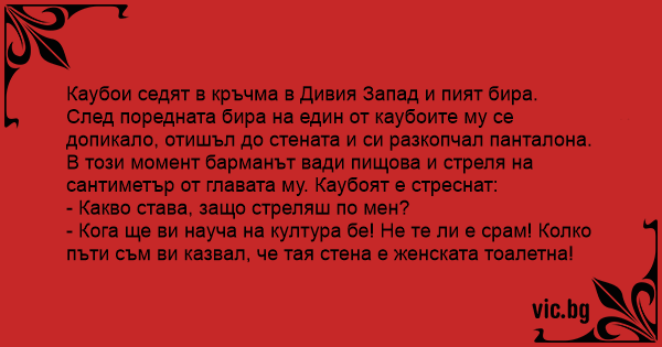 - Кога ще ви науча на култура бе! Не те ли е срам! Колко пъти съм ви казвал, че тая стена е женската тоалетна!