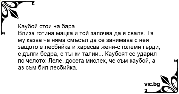 Влиза готина мацка и той започва да я сваля. Тя му казва че няма смъсъл да се занимава с нея защото е лесбийка и харесва жени-с големи гърди, с дълги бедра, с тънки талии... Каубоят се ударил по челото: Леле, досега мислех, че съм каубой, а аз съм бил лесбийка.