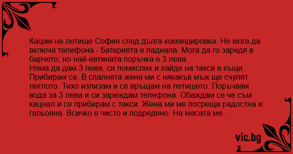 Няма да дам 3 лева, си помислих и хайде на такси в къщи. Прибирам се. В спалнята жена ми с някакъв мъж ще счупят леглото. Тихо излизам и се връщам на летището. Поръчвам вода за 3 лева и си зареждам телефона. Обаждам се че съм кацнал и се прибирам с такси. Жена ми ме посреща радостна и гальовна. Всичко е чисто и подредено. На масата ме чакат сочни пържоли и бутилка от любимата ми ракия, салати и мезета. Хапвам, целувам се с жена си, попийвам, целувам се с жена си и си мисля "За някакви си 3 лева, каква жена щях да изпусна?"